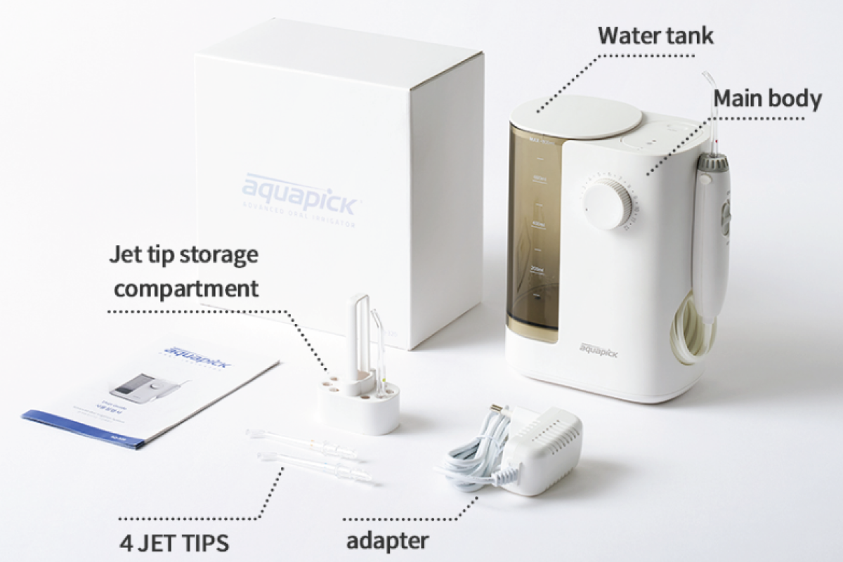 Aquapick AQ-320 has a built-in tip storage that takes up no space which holds up to 8 jet tips